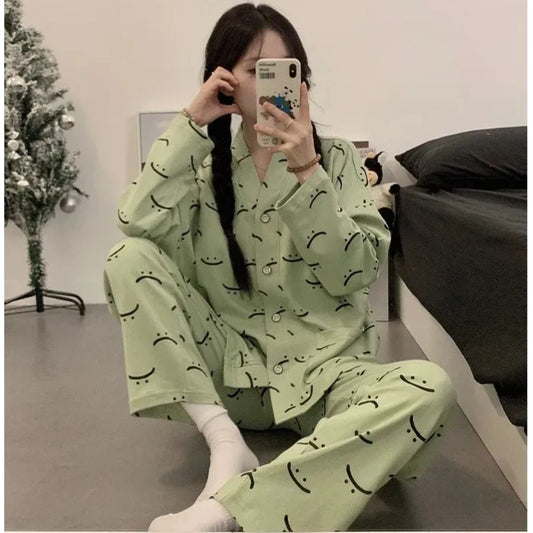Green Smiley V-Neck Button Printed PJ Set For Her
