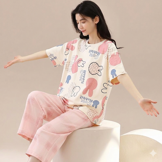 Off White with Pink Multi Rabbit Half Sleeves Printed PJ Set For Her