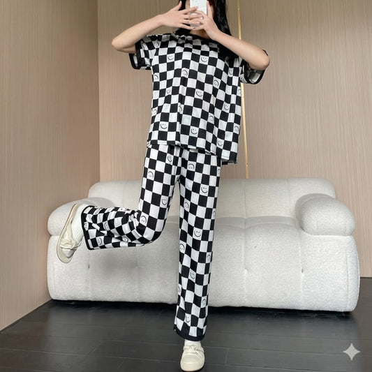 Off White with Black Cheq Smiley Half Sleeves Printed PJ Set For Her