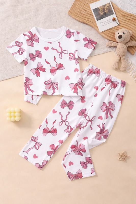 White with Pink Bow Printed Half Sleeves Kids Suit