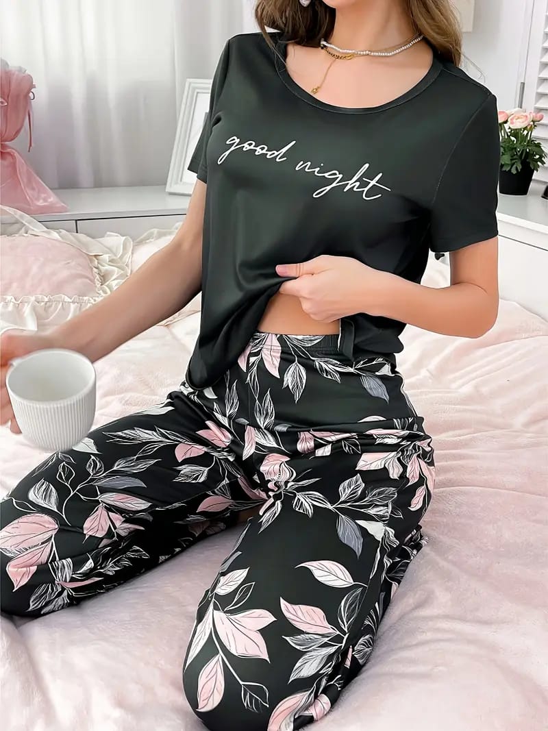 Black Good Night Printed with Floral Printed Pyjama Set For Her