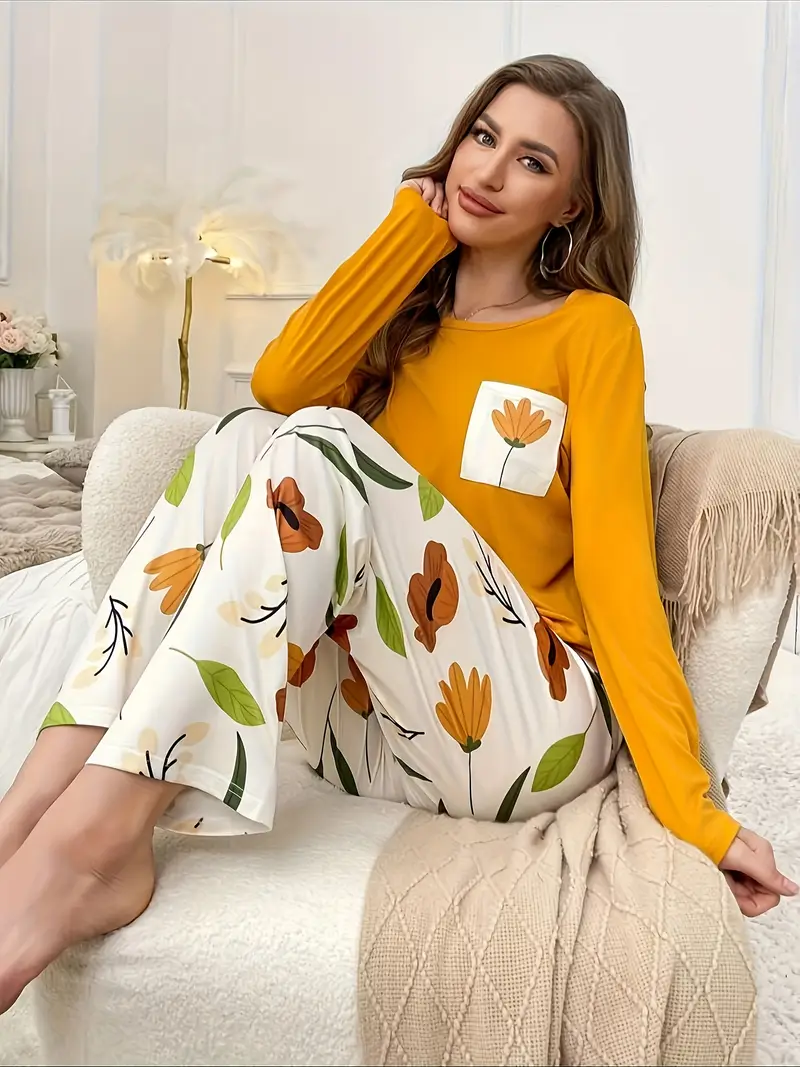 Mustard Yellow Floral Pocket Printed PJ Set For Her