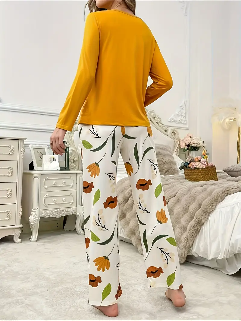 Mustard Yellow with Black Floral with Black Floral Pajama Printed PJ Set For Her
